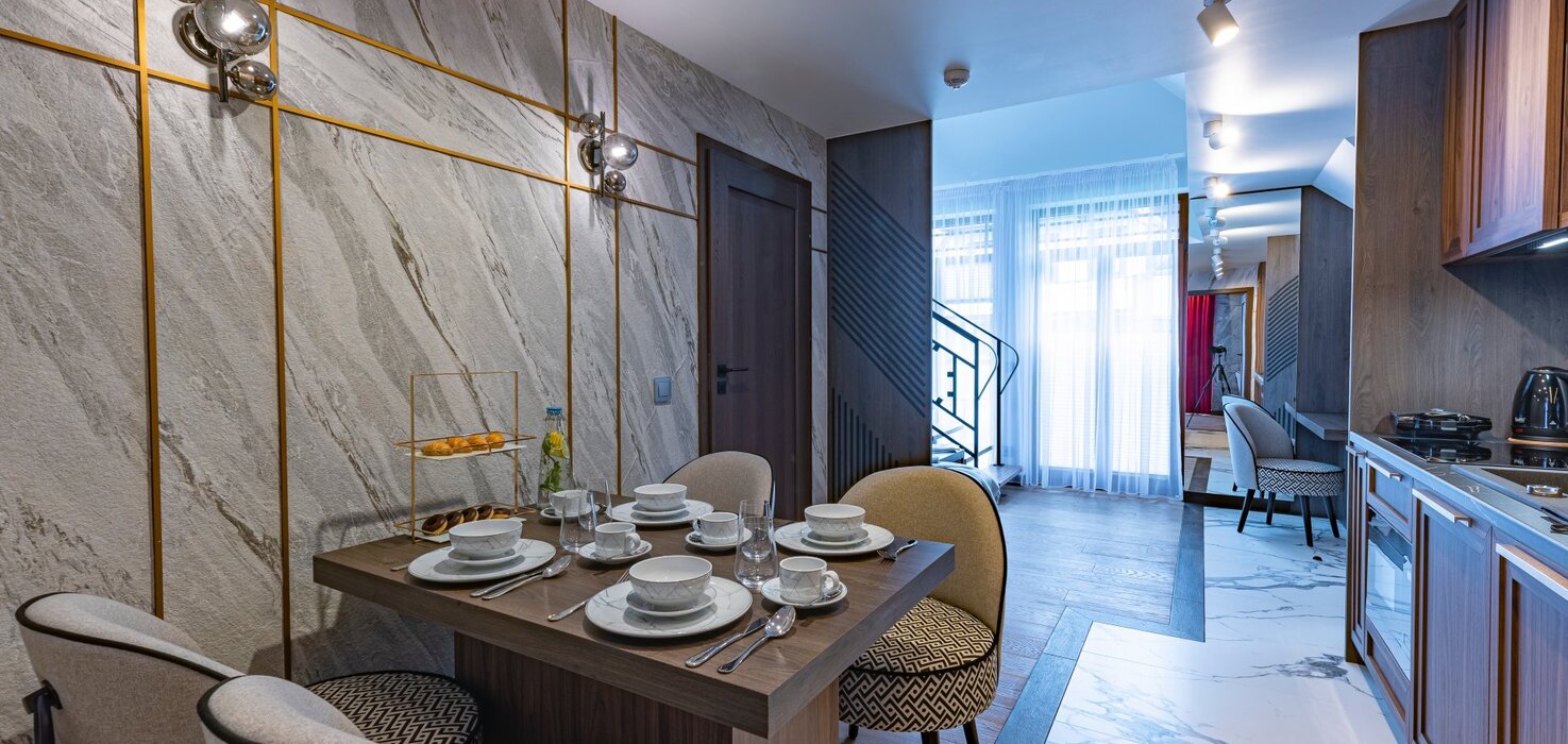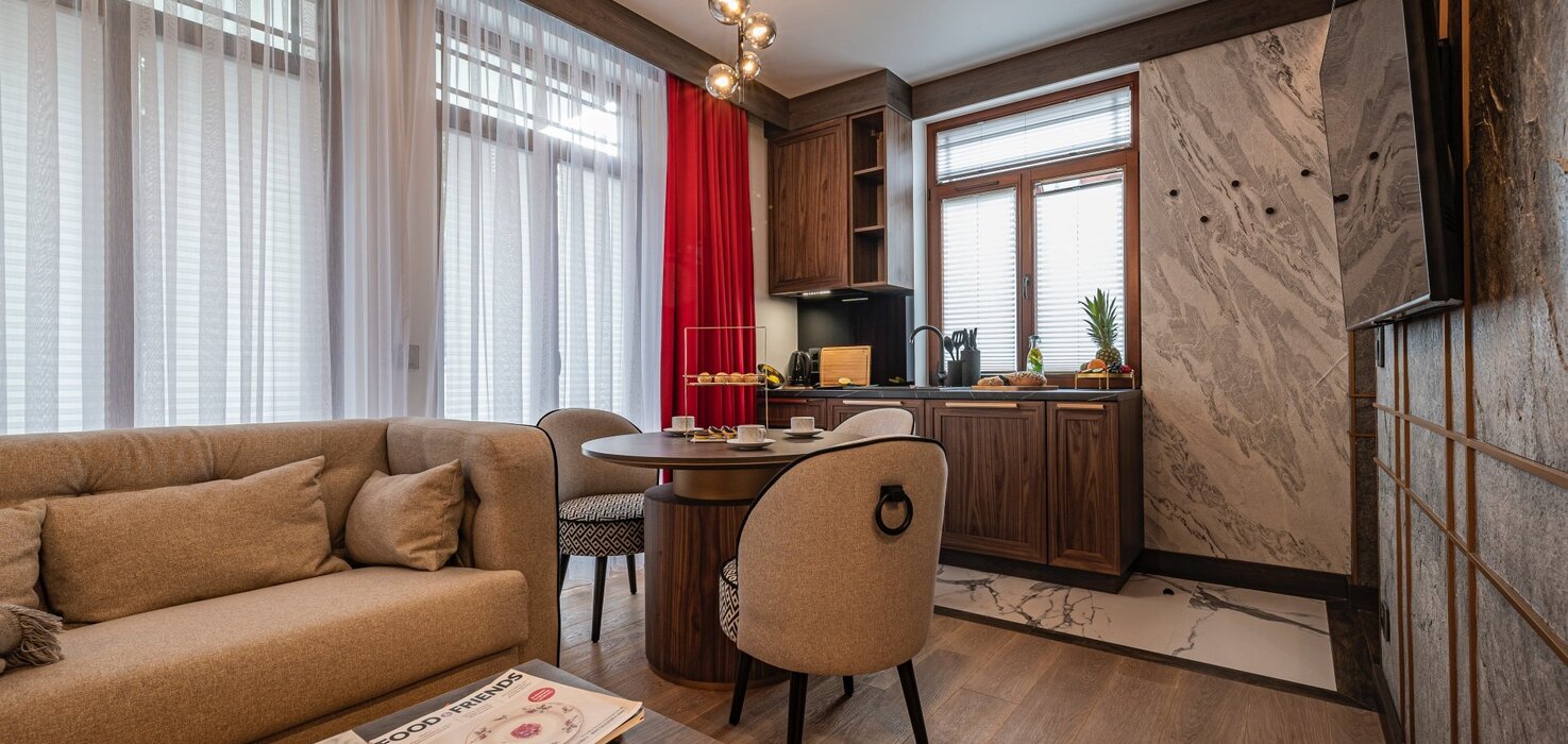 Aneks kuchenny, okrągły stolik oraz cztery wygodne krzesła.