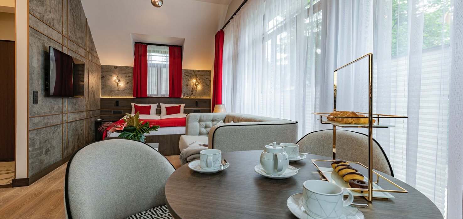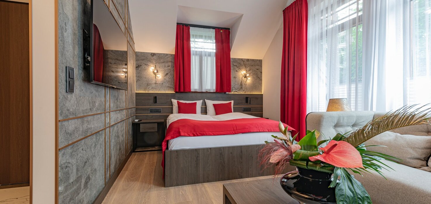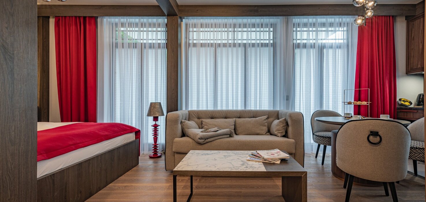 Pokój z wnęką na podwójne łóżko, oraz z sofą, stolikiem kawowym, i duzym lustrem.