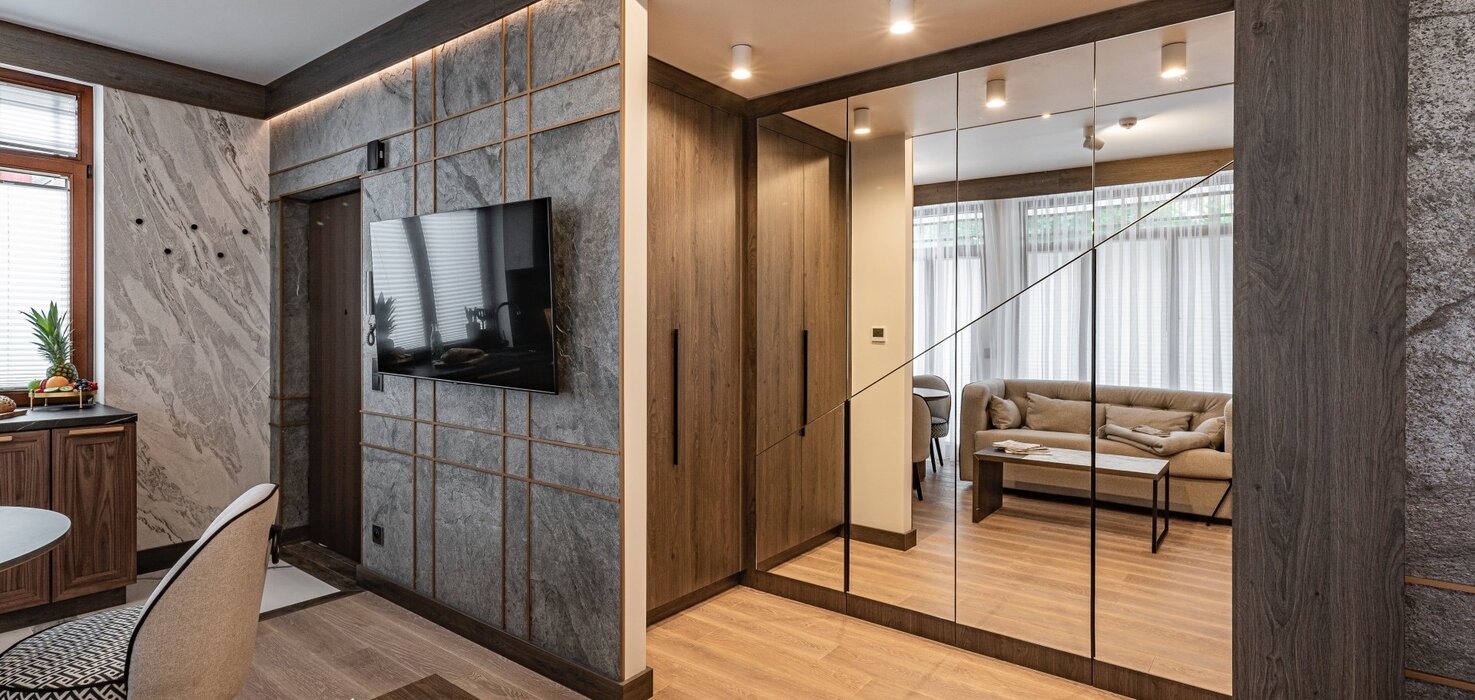 Widok na wejście do pokoju, dekorację z kwiatów i telewizor na ścianie.